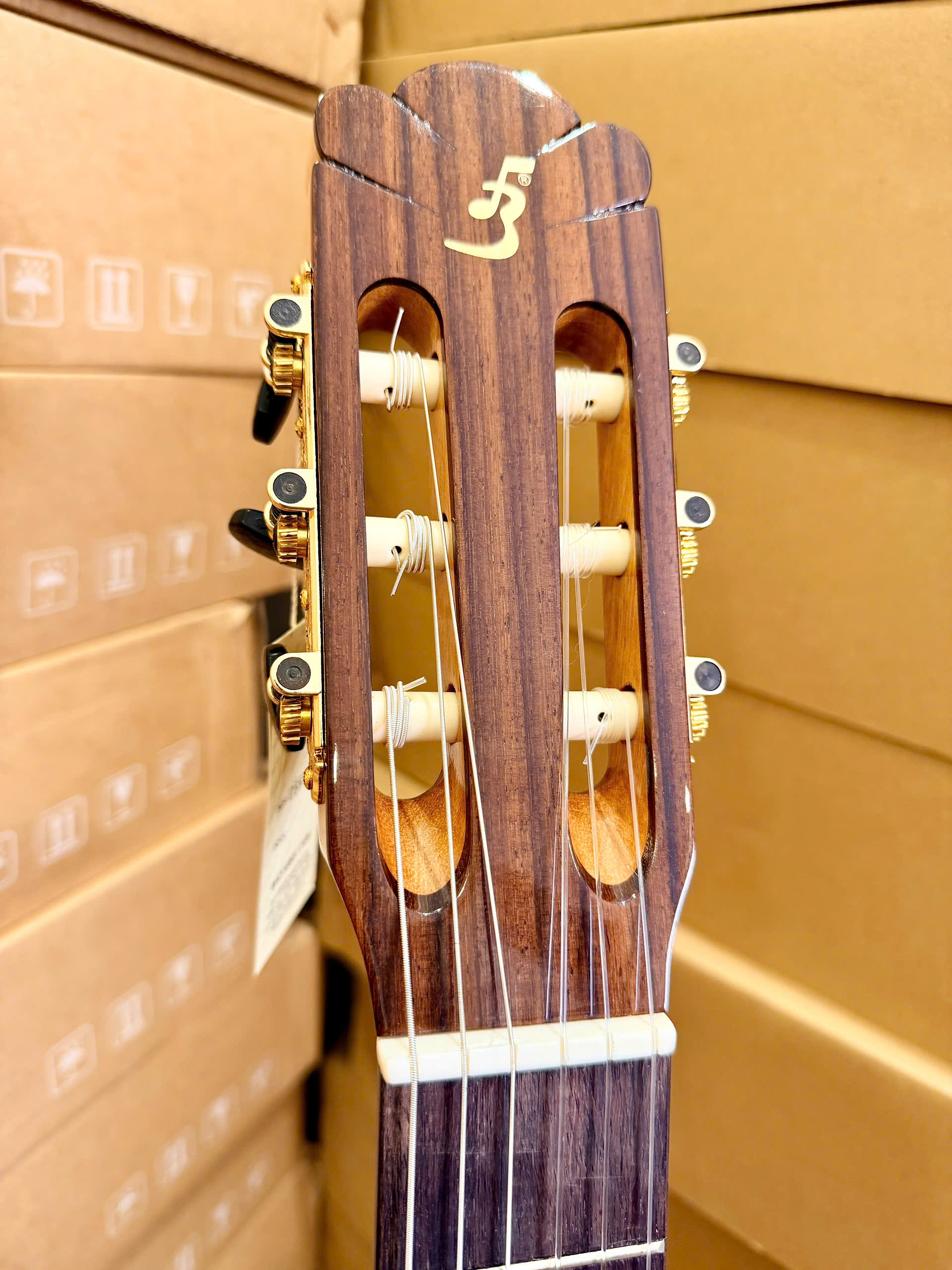 Lưng và hông (Back & Sides): Gỗ Hồng đào kỹ (Rosewood Việt Nam) hoặc Cẩm lai. Đây là loại gỗ quý giúp tăng cường độ sâu của dải âm trầm và sự cộng hưởng nội tại rất tốt.