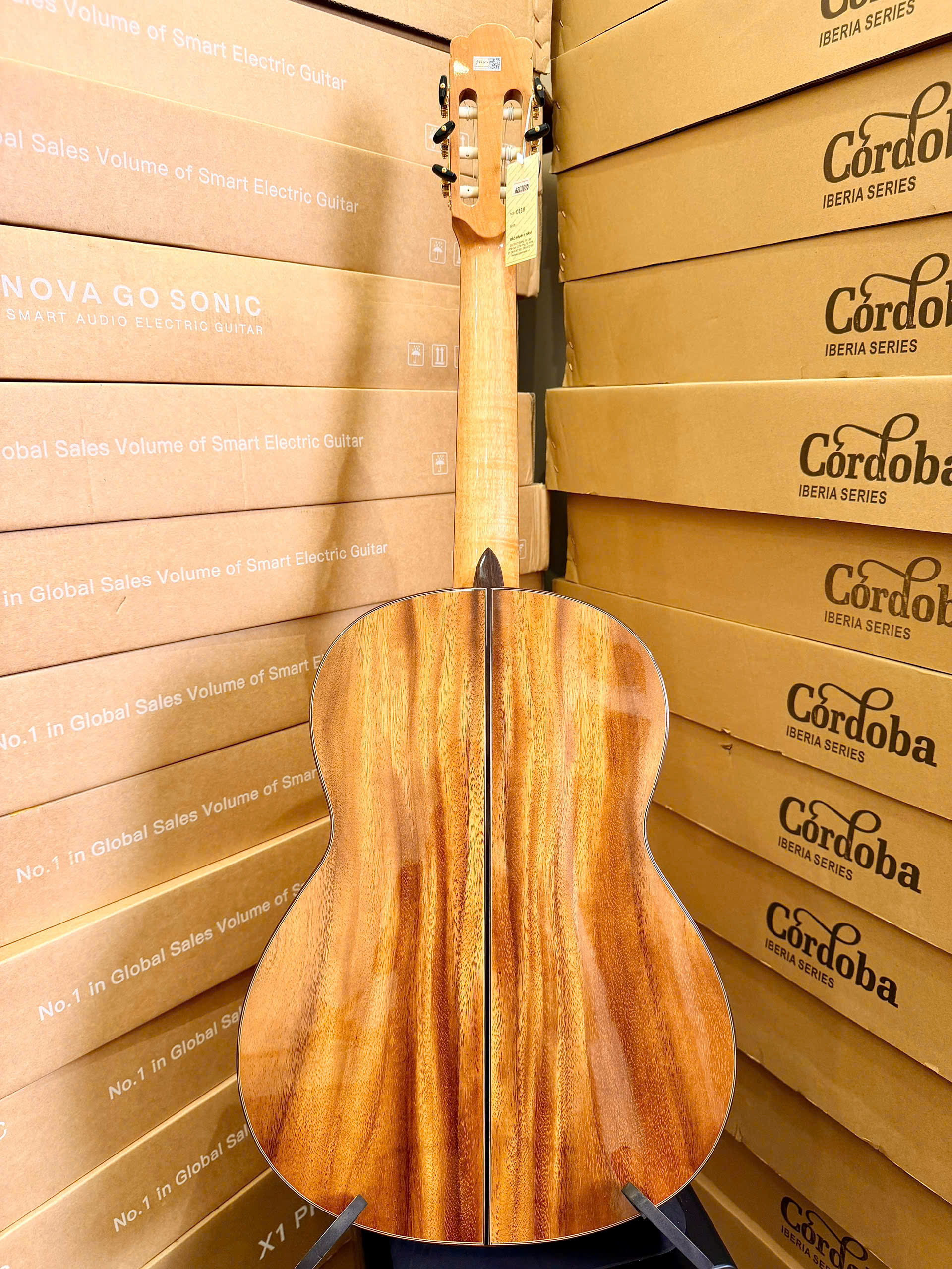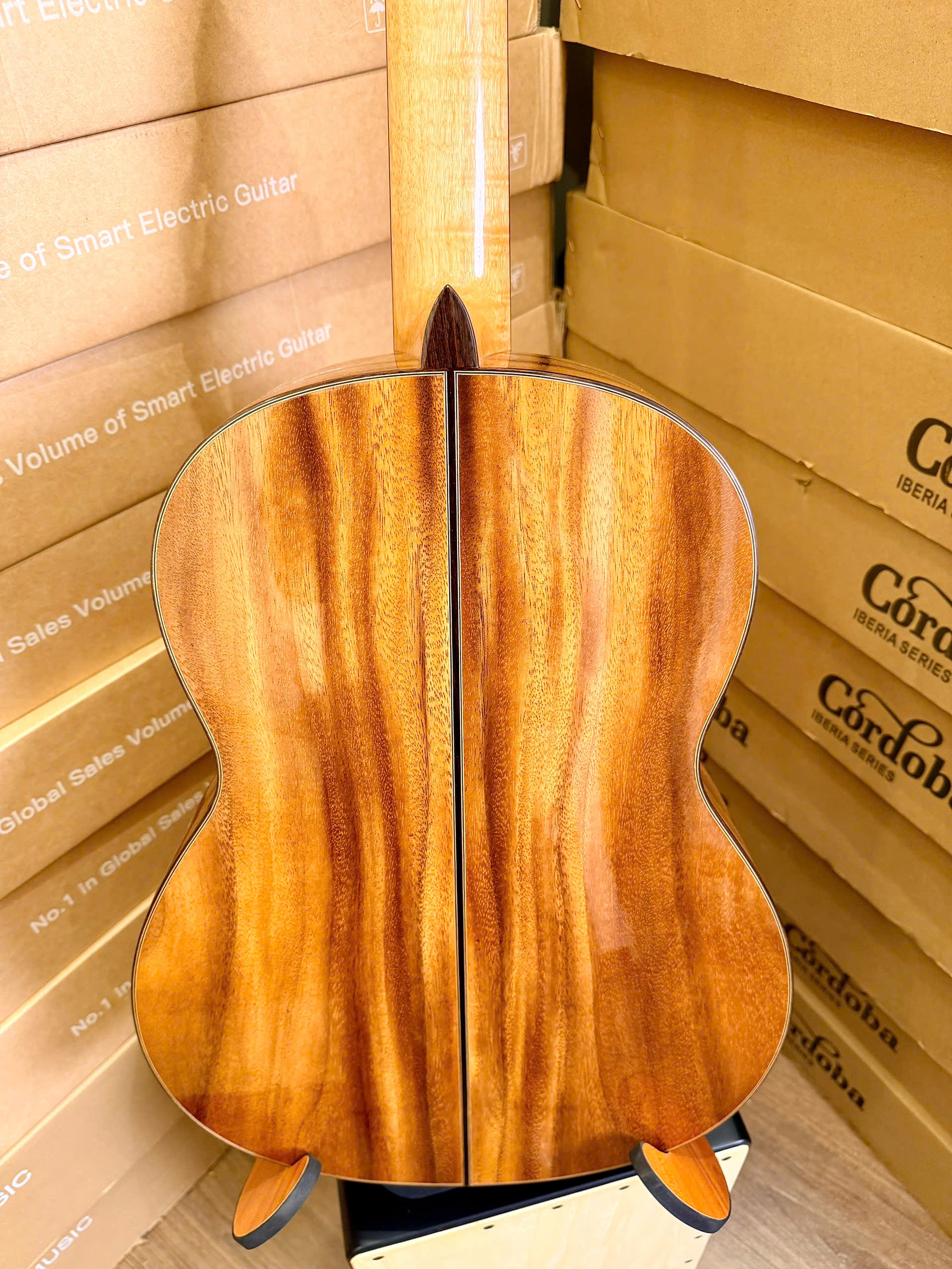 Lưng và hông (Back & Sides): Gỗ Hồng đào kỹ (Rosewood Việt Nam) hoặc Cẩm lai. Đây là loại gỗ quý giúp tăng cường độ sâu của dải âm trầm và sự cộng hưởng nội tại rất tốt.